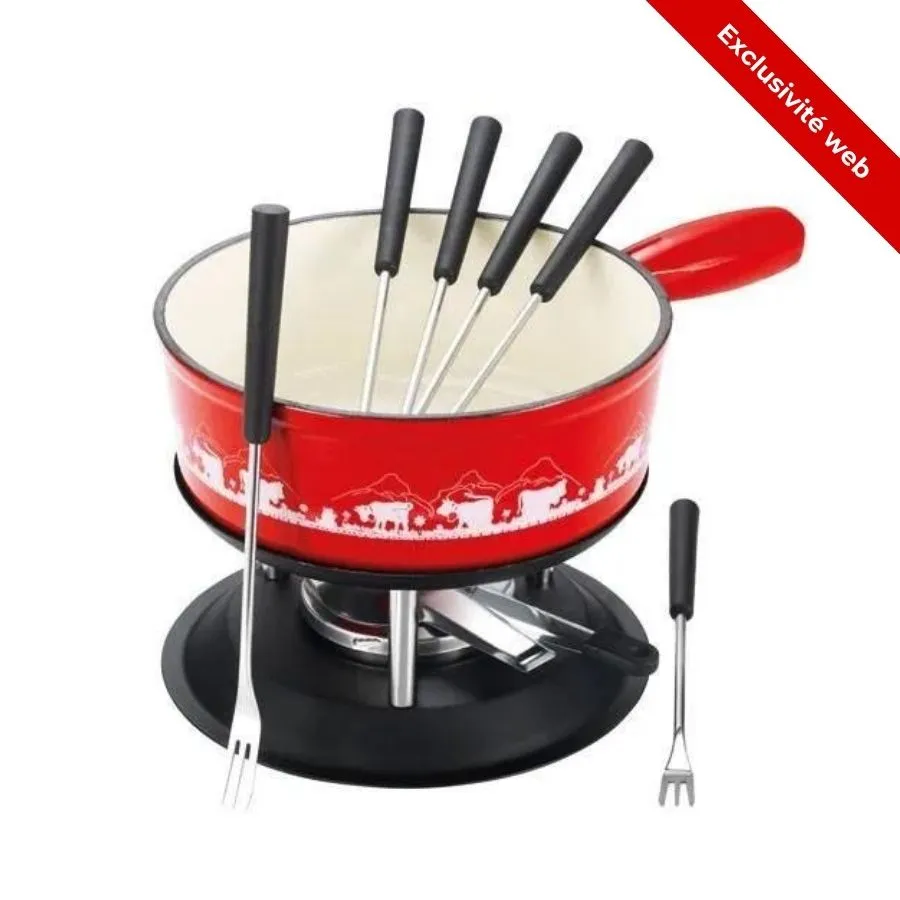 - Contenu: 1 poêlon en fonte émaillée (24 cm), 1 réchaud en fer forgé, 6 fourchettes à fondue (manche noir), 1 brûleur